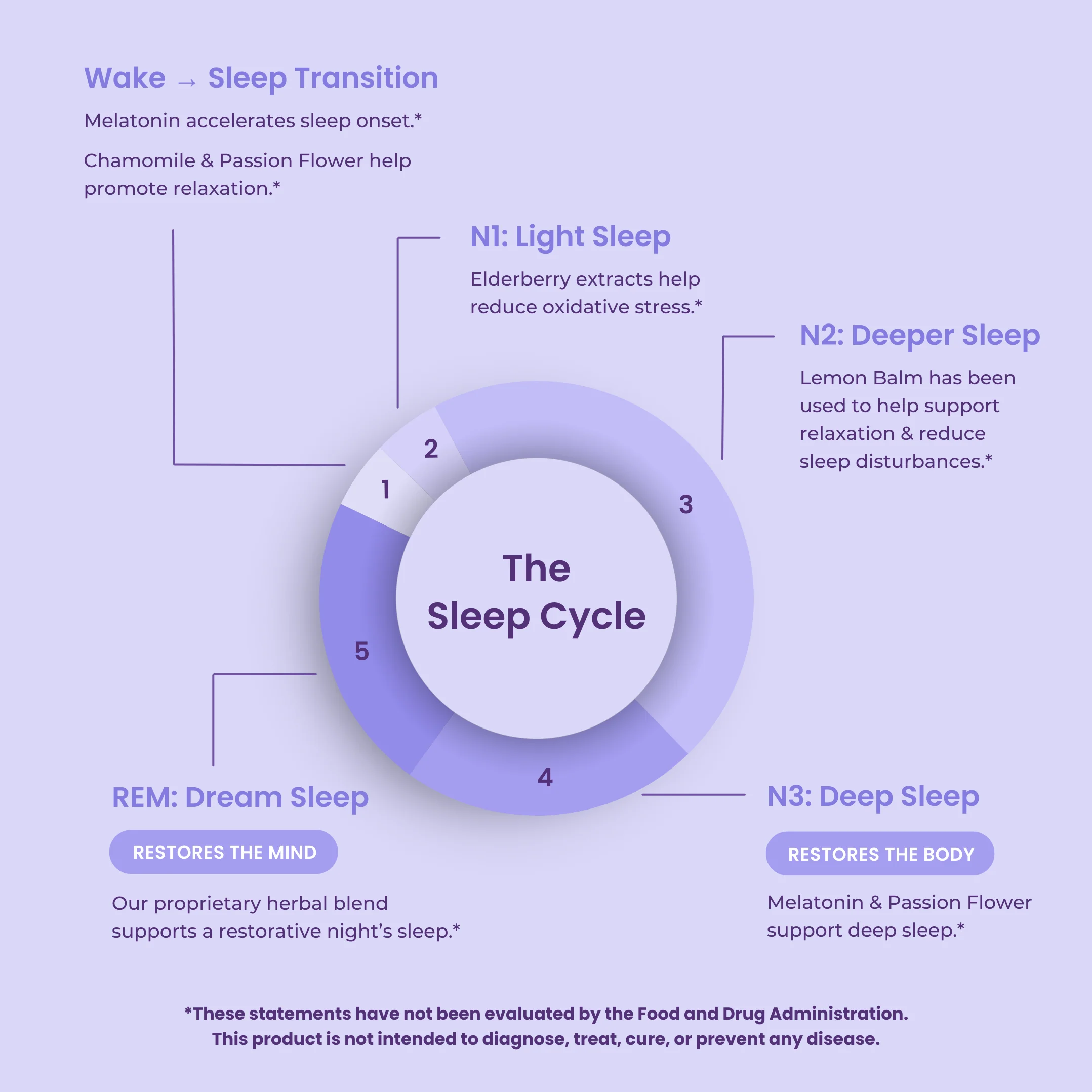 With melatonin (1 mg or 5 mg) to help regulate sleep cycles and circadian rhythm, a blend of passion flower, chamomile, and lemon balm helps promote relaxation and ease the mind before bed, while elderberry adds antioxidant support, contributing to overall wellness as part of your nighttime routine.